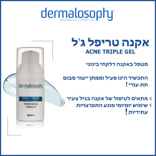 ✔️ טריפל ג'ל – מפחית יצור סבום תת-עורי ועודפי שומן בעור, מפחית פצעונים באקנה ומונע התפרצויות עתידיות.